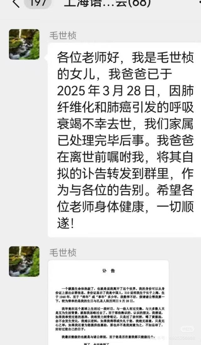 清明假期期间,小红书账号“学术与生活”分享了一篇文章《为自己写讣告的教授!》,文中一张微信群截图显示,毛世桢的女儿用父亲的微信账号,在群里发布消息称:“我爸爸已于2025年3月28日,因肺纤维化和肺癌引发的呼吸衰竭不幸去世,我们家属已处理完毕后事。我爸爸在离世前嘱咐我,将其自拟的讣告转发到群里,作为与各位的告别……”