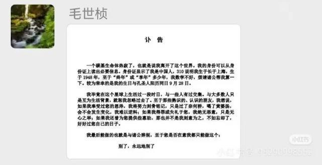 毛世桢先生在为自己撰写的讣告中写道:“一个碳基生命体热寂了,也就是说我离开了这个世界……我毕竟在这个星球上生活过一段时日,与一些人有过交集。与大多数人只是互为生活背景,就恕我忽略过去了。至于那些熟识的、认识的朋友,我想说,如果我奉受过您的恩泽,我将努力刻骨铭记,只是过了奈何桥,喝了黄婆汤,会不会发生变化,我难以逆料;如果我得罪或失礼于您,我绝无恶意,只是无心之举;如果我还曾为您提供些惠助,那也并不是我刻意为之,不如忘却了,好好过您自己的日子。”讣告情真意切,向世间作了最后的道别,“我最后能做的也就是与诸公辞别。别了,永远地别了!”