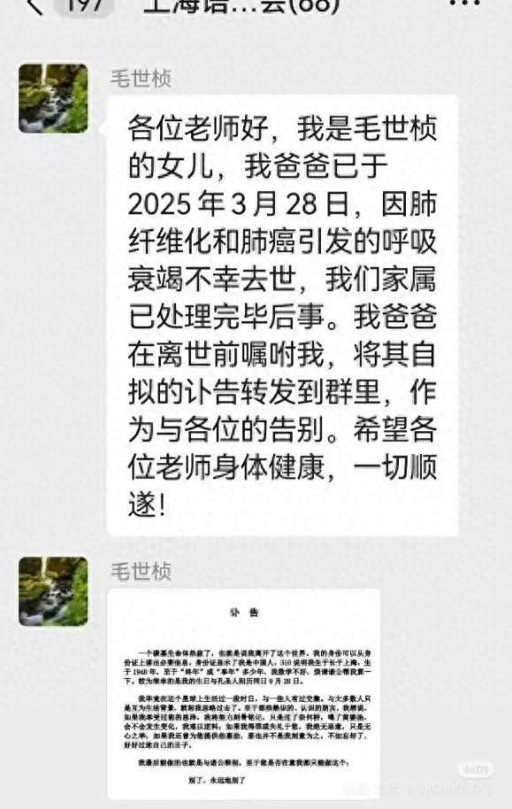 大皖新闻记者注意到,在网上流传的一个微信群聊天记录显示,微信昵称为“毛世桢”的用户在群聊内发布消息称,父亲于2025年3月28日因病去世,“我爸爸在离世前嘱咐我,将其自拟的讣告转发到群里,作为与各位的告别。”