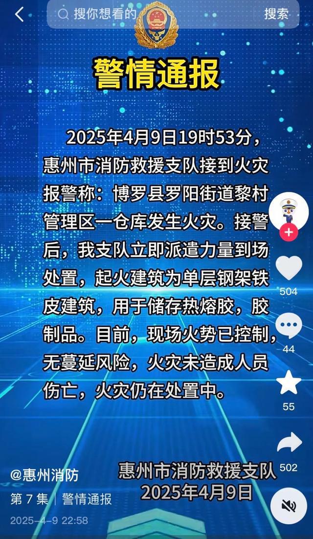 当晚10时许,惠州消防官方短视频账号发布通报称,此次起火建筑为单层钢架铁皮建筑,用于储存热熔胶、胶制品。现场火势已控制,无蔓延风险,火灾未造成人员伤亡。