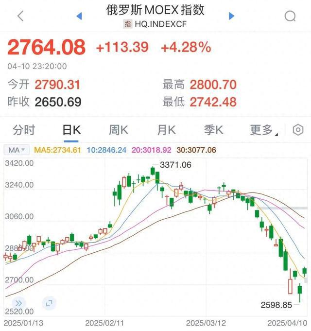 当地时间4月10日,俄罗斯股市大涨,俄罗斯RTS指数涨超5%,MOEX指数涨超4%。