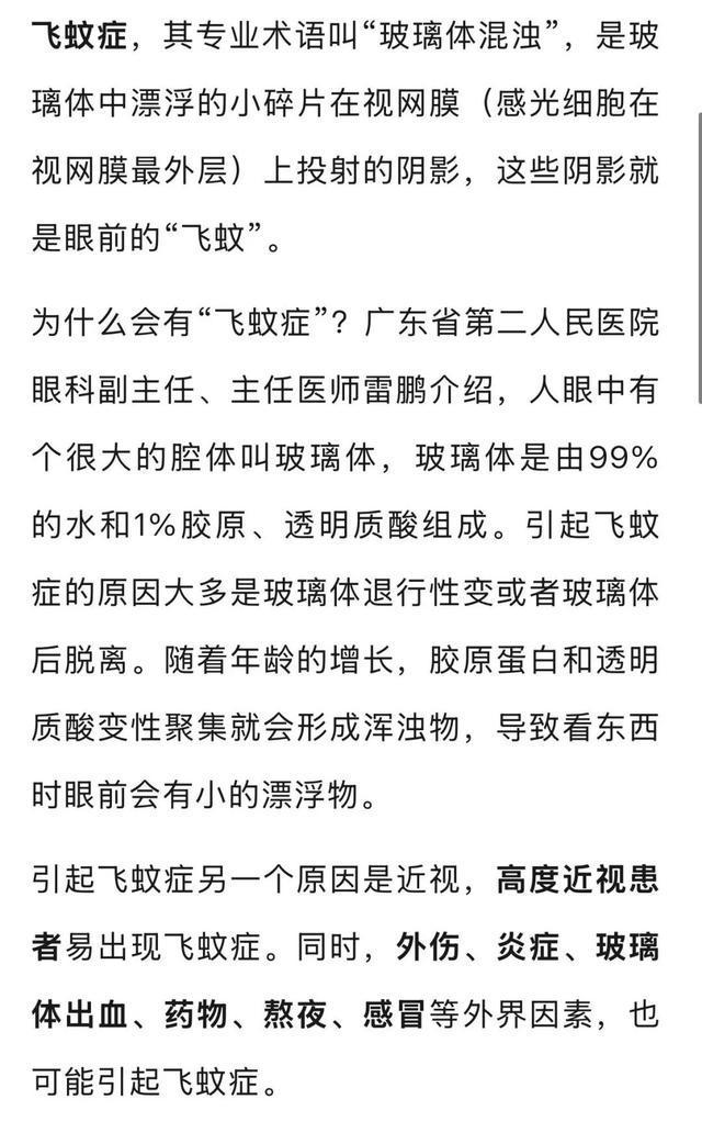 “飞蚊症”是不是严重的病变?据介绍,飞蚊症大多数是生理性的,也称为良性的。如果患者单眼或者双眼出现飞蚊现象,经过专业眼科医师的检查未发现眼内器质性病变,经过一段时间观察,这些现象并没有加重或产生变化,飞蚊位置也固定的话,多为良性。这些良性“飞蚊”常见的形状是纤维条索状、Weiss环、云雾状。