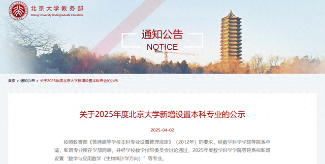 近日,北京大学教务处发布《关于2025年度北京大学新增设置本科专业的公示》。拟新增设置“数学与应用数学(生物统计学方向)”“数字治理”“工商管理专业(数字经济管理方向)”等3个专业。
