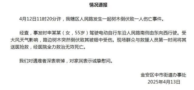 4月13日,安徽六安市金安区发布情况通报,该区发生一起树木倒伏致人伤亡事件。具体通报如下:情况通报4月12日11时20分许,我辖区人民路发生一起树木倒伏致一人伤亡事件。经查,事发时申某某(女,55岁)驾驶电动自行车沿人民路南侧由东向西行驶。受大风天气影响,路边树木突然倒伏致其被砸中受伤。现场群众与救援人员第一时间将其送医抢救,经医院全力救治无效死亡。 我们对遇难者深表哀悼,对家属表示诚挚慰问。金安区中市街道办事处2025年4月13日
