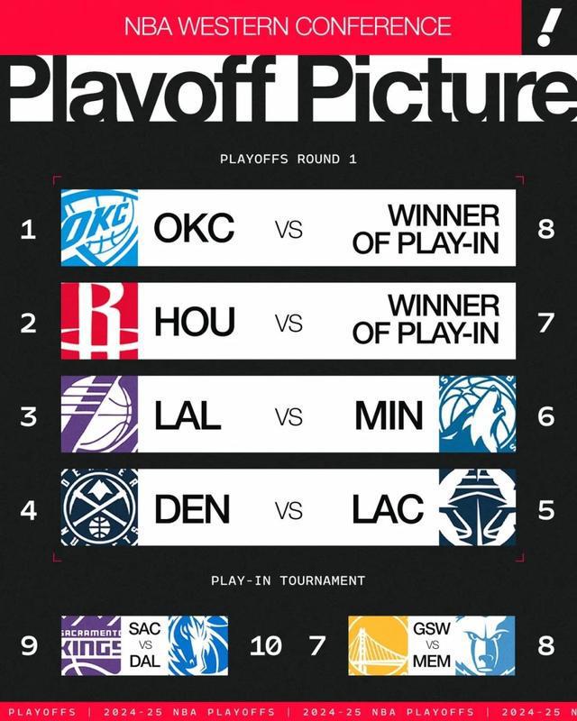 另外两场事关排名的比赛中,掘金126比111轻松击败早已锁定西部第二的火箭,顺利锁定西部第四;森林狼116比105击败爵士,最终力压输球的勇士排名西部第六直接进入季后赛。至此,西部常规赛最终排名出炉,前六名分别是雷霆、火箭、湖人、掘金、快船和森林狼,季后赛首轮对阵也已经出炉:西部第四掘金将对阵西部第五快船,掘金占据主场优势;西部第三湖人将对阵西部第六森林狼,湖人占据主场优势;西部第二火箭将对阵勇士和灰熊之间的胜者;西部第一雷霆则将对阵勇士灰熊的负者与国王独行侠胜者之间较量的胜者。