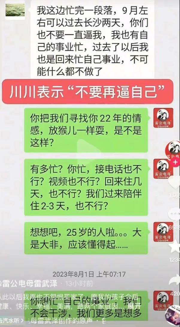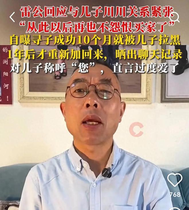 雷公本名雷武泽,22年前孩子川川被拐,去年6月好不容易通过DNA认亲,当时抱着儿子哭成泪人的画面,感动了不少人。谁能想到,短短10个月,父子俩就闹到微信拉黑、互不相见的地步。导火索是雷公被曝在聊天记录里不断给儿子施压:又是让赶紧迁户口、改回原名,又是提“继承养父母财产后回来帮家里还债”,甚至拿“别人家寻亲后直播带货赚大钱”当例子,催着川川一起“吃网络饭”。