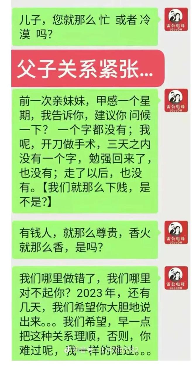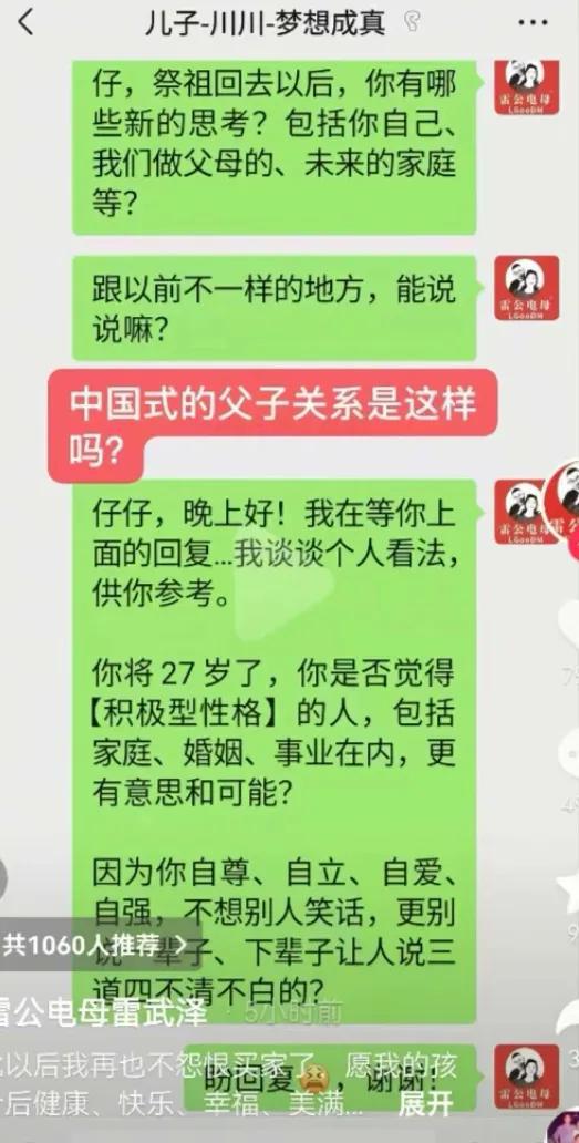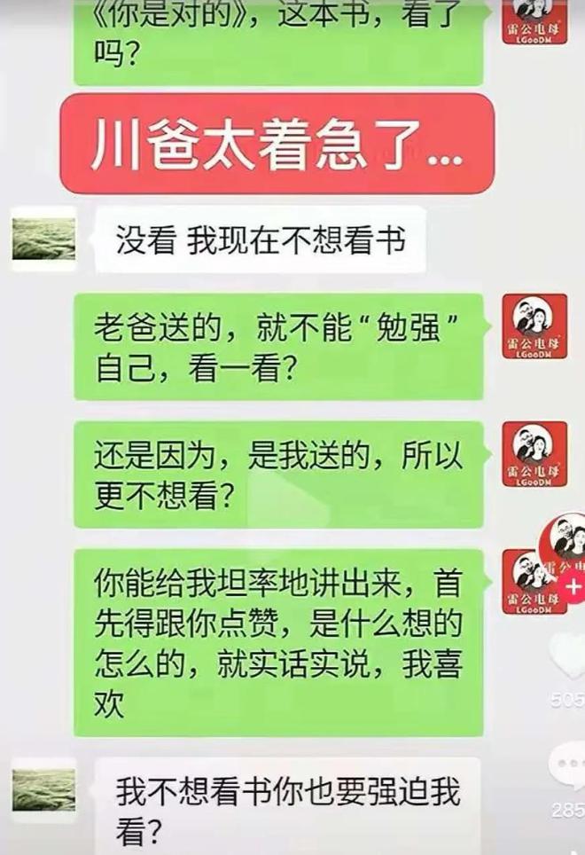 看了他们的聊天记录,才知道啥叫“窒息式沟通”。雷公一口一个“你必须”“你应该”,字里行间都是命令:“户口赶紧迁回来,这是头等大事”“改回本名,不然别人怎么知道你是我儿子”“你看人家老郭家、老孙家,认亲后带货多红火,咱们也得跟上”。有网友吐槽:“这哪是认儿子,分明是在套牢一个‘人形提款机’。”更有人翻出旧闻:当年川川被拐,跟雷公把孩子交给邻居看管、结果邻居疏忽有关,现在反倒理直气壮地要求孩子“报恩”,逻辑实在让人看不懂。