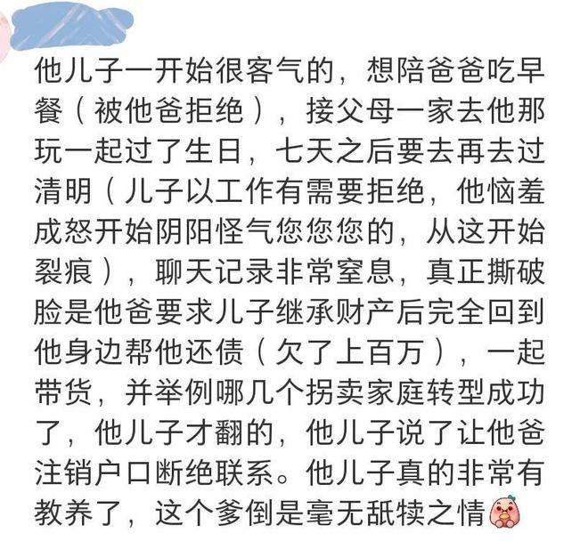 这事闹到现在,川川拉黑父亲、要求注销户口,看似绝情,实则是一个成年人对过度控制的本能反抗。想想也是,突然有个人拿着“血缘证明”,要求你推翻现有的生活、情感和身份,还要为他的人生负债买单,换谁都得躲。网友“老猫炕上睡”说得扎心:“雷公眼里,儿子不是活生生的人,是他弥补人生失败的‘救命稻草’。可稻草也有自己的根,凭啥被你拔出来插进自家田里?”