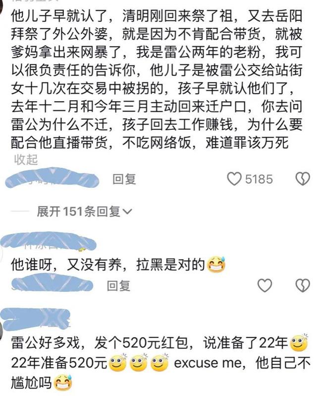 评论区里,网友的吐槽那叫一个犀利。有人说:“雷公早就在心里写好了剧本——儿子被拐到穷山沟,等着他救苦救难,然后父慈子孝一起靠流量赚钱。可人家川川在养父母家过得好好的,凭啥配合你演苦情戏?”还有人直指核心:“养恩大于天,人家养父母养了20年,你没养过一天,上来就谈血缘绑架,脸呢?”更有人对比另一个寻亲父亲郭刚堂——人家儿子认亲后选择回养父母身边,郭刚堂说“尊重孩子的选择,来日方长”,这才叫把亲情放在第一位。