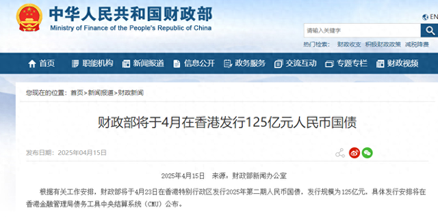 财政部将于4月在香港发行125亿元人民币国债 访客 2025-04-15 203 抢沙发 默认 4月15日,财政部宣布将于4月23日在香港特别行政区发行2025年第二期人民币国债,发行规模达到125亿元人民币。此次发行的具体安排将通过香港金融管理局债务工具中央结算系统(CMU)公布。来源:财政部网站 标签: 财政部 香港特别行政区 海报 阅读 QQ 分享 微博分享 微信分享 分享 上一篇台前县:特色产业多点开花 产业升级蹄疾步稳 下一篇投身分类行动,点亮社区“绿”动 台前县:特色产业多点开花 产业升级蹄疾步稳上一篇 投身分类行动,点亮社区“绿”动下一篇 相关推荐 财政部香港特别行政区 广西白糖现货最新价格概览 2025-12-17 今年大蒜价格走势分析,最新行情报告 2025-12-17 股指期货手续费详解,了解最新收费标准 2025-12-17 恒生指数期货代码详解 2025-12-17 5公分沥青路面价格预算表详解 2025-12-17 2022白银后市走势分析与预测 2025-12-17 焦煤期货指数走势分析 2025-12-16 国内期货行情软件实时分析与预测 2025-12-16 发表评论取消回复 快捷回复: 评论列表 (暂无评论,203人围观)参与讨论 还没有评论,来说两句吧...