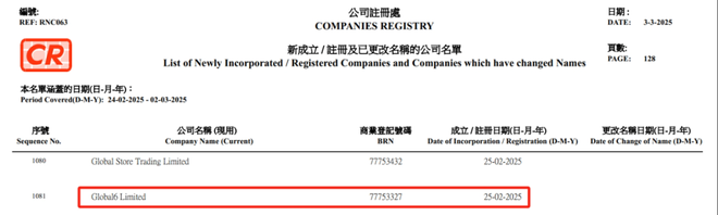 香港政府文件显示, Global6 Limited于2025年2月25日在香港注册成立,商业登记编号为 77753327。