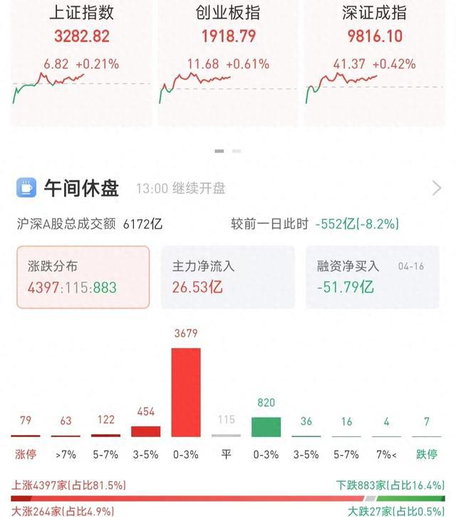 4月17日,A股三大指数低开高走,截至午盘,上证指数收报3282.82点,涨0.21%;深证成指收报9816.10点,涨0.42%;创业板指收报1918.79点,涨0.61%。全市场半日成交额6356亿元,较上日缩量600亿元。全市场超4300只个股上涨。