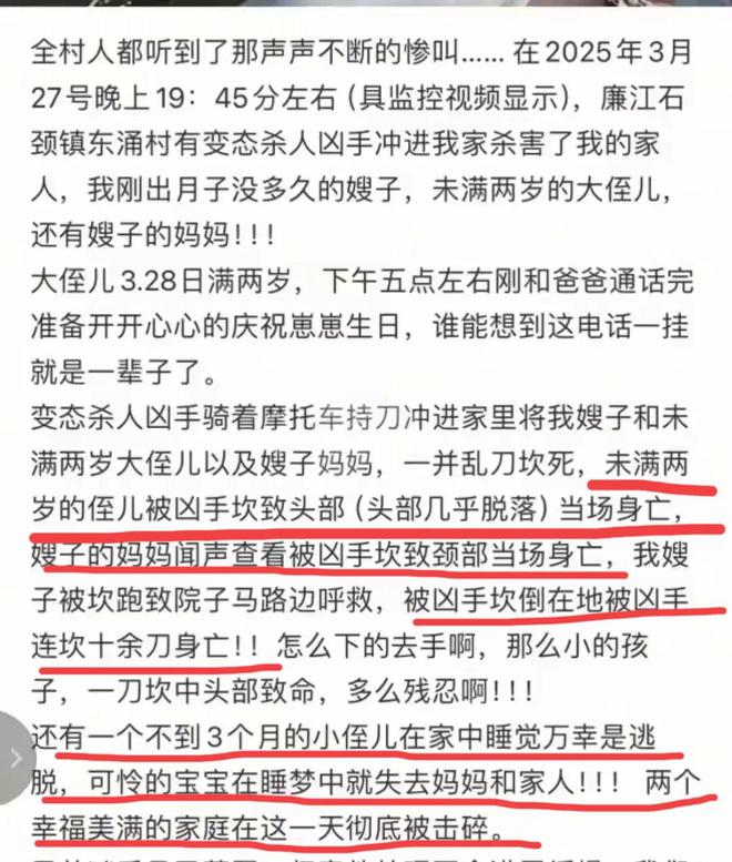 广东廉江的春天本应是万物萌发的时节,却在3月27日这天蒙上了血色阴影。一个即将迎来两岁生日的幼童,一位刚坐完月子的年轻母亲,还有年逾七旬的外婆,三人的生命永远定格在了那个寻常的夜晚。当父亲还在电话里与孩子约定次日的生日蛋糕时,谁也想不到,一场灭顶之灾正骑着摩托车驶向这个温馨的小家。