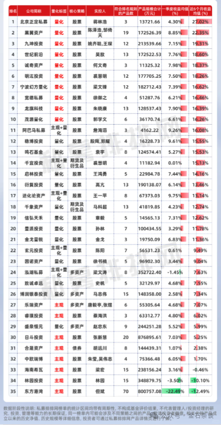 其中,在涨幅榜单中,北京正定私募近半年收益27%,近一个季度盈利4.3%,位列首位。这家私募是近期崛起的新秀,2022年成立,2024年6月规模才突破20亿,但2025年1月直接突破了100亿,核心人物均是清华背景,均对人工智能、大模型有比较深入的研究。