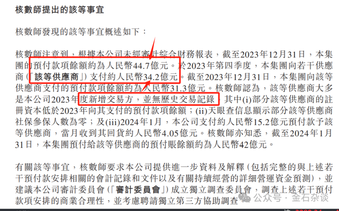 3月28日,彼时的核数师毕马威对公司预付款异常、付款对象和交易流水提出质疑。尤其公司整年预付款44.7亿,但仅仅四季度公司向若干供应商支付34.2亿。财务造假问题随之引发市场热议。