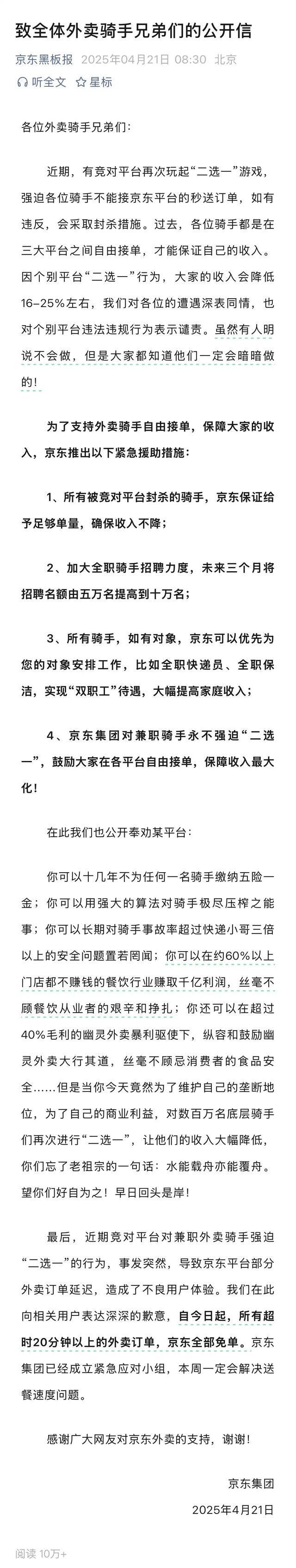 红星资本局4月21日消息,今日,“京东黑板报”发布致外卖骑手的公开信称,近期,有竞对平台再次玩起“二选一”游戏,强迫各位骑手不能接京东平台的秒送订单,如有违反,会采取封杀措施。