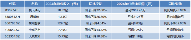 此外,3家公司已发布2024年业绩快报,其中凯大催化和居然智家实现盈利,思科瑞业绩亏损。另有2家公司披露了2024年业绩报告,中孚信息和天娱数科均录得亏损。
