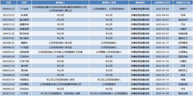 今年以来,证监会持续保持“长牙带刺”的严监管态势,多家上市公司因涉嫌信息披露违法违规被立案调查。截至4月18日,*ST金科(000656.SZ)、皇氏集团(002329.SZ)、美晨科技(300237.SZ)等19家公司被纳入调查名单,信息披露违法违规仍然是上市公司被立案调查的最主要原因之一。