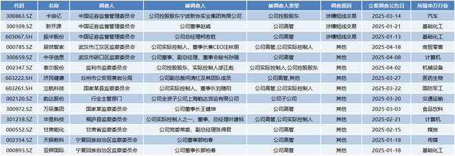 除上述原因外,卡倍亿(300863.SZ)、新开源(300109.SZ)、振华股份(603067.SH)等3家公司因涉嫌短线交易被立案调查,居然智家(000785.SZ)、泰尔股份(002347.SZ)、天娱数科(002354.SZ)、韵达股份(002120.SZ)等11家公司因其他原因被立案。