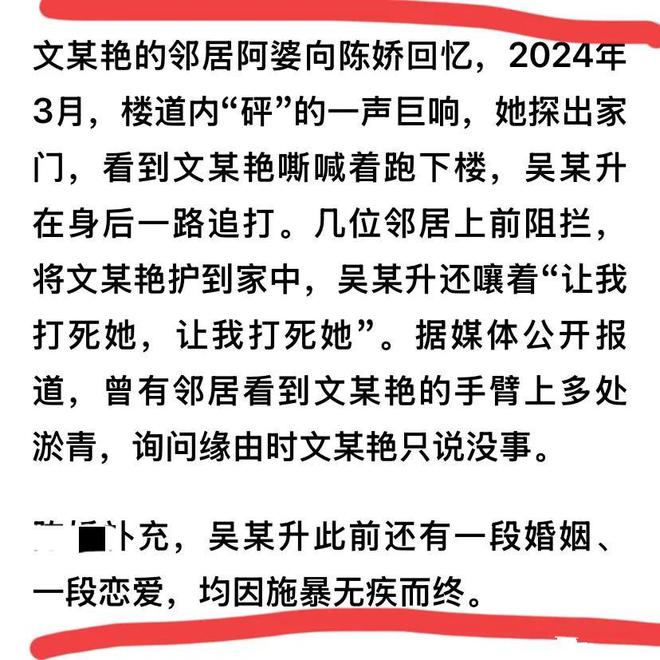 文老师的孩子们得知真相后,悲痛欲绝。他们这才知道,这些年母亲过得有多么不容易。因为和吴某不熟,一家人一年到头也只在过年过节吃顿饭,根本没察觉到母亲遭受的苦难。邻居们也纷纷向孩子们透露,吴某之前的婚姻和感情都因为他的坏脾气告吹,案发前几个月,还曾追打着文老师出门,嘴里喊着“让我打死她” ,当时要不是邻居们阻拦,后果不堪设想。