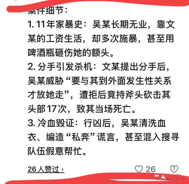 这件事在网上引发了热议。网友“豁达柑桔tC3”特别不解:“为什么要找一个大11岁还用她的钱的无业老男人?” 不少人都觉得文老师性格太软弱,才会陷入这样的悲剧;“灵敏水滴Wf”感慨:“没办法!有的人就是有受虐倾向!被暴打11年都不离不弃!说你是‘真爱’还是‘真傻’”;“春城徐哥”愤怒地说:“死刑不足以赎罪,必须像八九十年代那样开公判大会千刀万剐,让人间每一只恶魔胆寒” ;还有人以自身经历劝诫大家,找对象一定要远离脾气暴躁的人,“单身保命”也成了不少网友的感慨。
