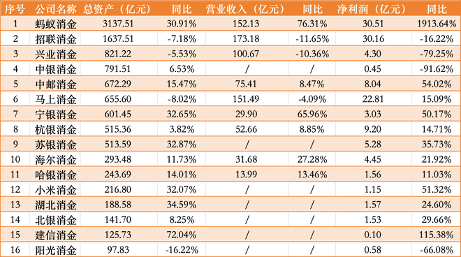 图源:图虫创意时代周报记者就蚂蚁消金业绩等相关问题致电该公司并发送采访提纲,截至发稿未获回复。对此,素喜智研高级研究员苏筱芮对时代周报记者表示,一方面,部分头部消费金融机构在不良承压背景之下主动收缩业务规模,也有机构在探索从线下逐步向线上转型的过程中产生“阵痛”;另一方面,部分腰部机构出于本身规模基数较小、股东加大支持力度、切入差异化场景赛道等因素,迎来较好的增长期。蚂蚁消金于2021年6月4日成立并开业,主要承接蚂蚁集团旗下“花呗”“借呗”业务,股东包括蚂蚁集团、杭州数据集团、传化智联、宁德时代等。2023年,蚂蚁消金连续完成两轮增资,注册资本增至230亿元,位居31家持牌消费金融公司之首。时代周报记者注意到,蚂蚁消金2024年近七成利润集中在下半年。博通分析金融行业资深分析师王蓬博告诉时代周报记者,2024年蚂蚁消金净利润暴涨的主要原因是其2023年基数较低,2023年增资后,依照行业通用会计准则,蚂蚁消金增加了大额一次性拨备计提,导致当年利润较低。2024年这一影响消失,利润回归正常水平,使得净利润同比出现大幅增长。2025年2月26日,蚂蚁消金发布变更公告,其经营范围有多项调整。其中,存款业务上,吸收存款范围从股东境内子公司及境内股东,扩大到股东及其境内子公司等;借款业务新增向作为公司股东的境外金融机构借款;债券发行明确为发行非资本类债券;同时删减了代理销售与消费贷款相关保险产品及固定收益类证券投资业务。16家持牌消金机构业绩出炉其中,蚂蚁消金、招联消金、兴业消金、马上消金4家机构营收过百亿,蚂蚁消金、中邮消金、宁银消金、小米消金、建信消金5家机构净利润增速超过50%。具体来看,蚂蚁、招联继续领衔第一梯队,但不同于蚂蚁消金,招联消金2024年实现营业收入173.18亿元,同比下降11.65%;净利润30.16亿元,同比下降16.22%。对于兴业消金、中银消金等净利润下跌的原因,王蓬博认为,市场竞争激烈,部分消金机构传统上依赖大额贷款和线下业务,这种模式在当前市场环境下显得不够灵活,加之资产质量下降,长尾客群的违约风险增加,不良贷款率上升,核销不良资产增加了成本,压缩了利润空间。时代周报记者还注意到,中邮消金、宁银消金、小米消金、建信消金等中尾部机构奋起直追,业绩表现亮眼。小米消金成立于2020年5月,自成立以来已连续4年盈利,其2021年-2024年的净利润分别为368万元、1084万元、7600万元、1.15亿元,2022年-2024年净利增速分别为194.57%、601.11%、51.32%。对于中尾部消金机构业绩普遍大涨的原因,王蓬博表示,中尾部机构业务本身基数小,在业务拓展和业绩增长方面具有更大的灵活性和空间,也更容易控制运营和风控成本;部分中尾部机构通过加强股东协同、与其他机构合作等方式,拓展业务渠道,提升了经营效益。