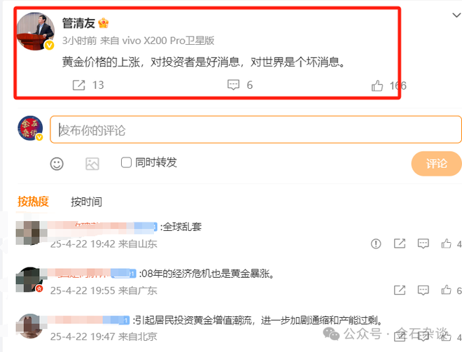 首先,金石杂谈看到不少博主因为“王晓雨”买入黄金都在灵魂发问:黄金见顶了?还有博主引述朋友的话: 黄金波动率高,把黄金仓位挪到低波动率的A股…