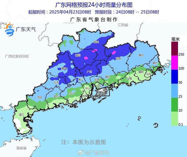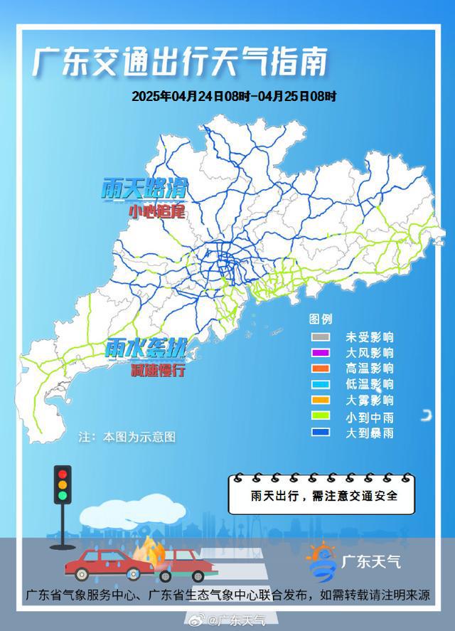 24日,韶关和清远市县阴天有暴雨局部大暴雨,河源、梅州北部、珠江三角洲北部市县雷阵雨转暴雨局部大暴雨,珠江三角洲中南部和粤西的北部市县多云到阴天,有中到强雷雨,其余市县多云到阴天,有分散(雷)阵雨。降水造成的路面湿滑和积水对公路交通会带来不利影响,出行前请大家关注气象、交通部门发布的最新信息,提前规划路线,避开低洼、易涝路段。雨天能见度较低,行车请减速慢行,保持安全车距,避免急刹!