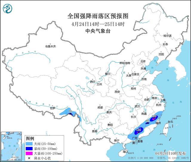 中央气象台4月24日10时继续发布暴雨蓝色预警:预计,4月24日14时至25日14时,广东中北部和珠三角地区、福建西南部和中北部、江西南部、浙江南部以及西藏东南部、云南西北部等地部分地区有大到暴雨,其中,福建中北部、广东中部等地局地有大暴雨(100~120毫米);上述部分地区伴有短时强降水(最大小时降雨量20~50毫米,局地可超过60毫米),局地有雷暴大风等强对流天气。
