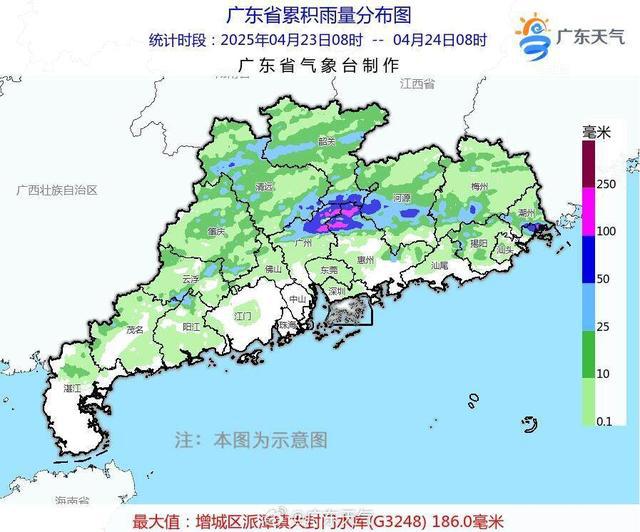据气象水文监测,4月23日08时到24日08时,全省平均雨量8.3毫米,有13个镇街录得超过100毫米的大暴雨,有41个镇街录得50毫米~100毫米的暴雨。各市雨量最大的镇街有:广州增城区派潭镇186毫米、惠州龙门县永汉镇145.9毫米、潮州饶平县汫洲镇110.2毫米、汕头澄海区东里镇104.3毫米、韶关新丰县丰城街道102.1毫米。