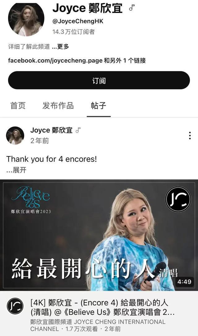 4月24日,有网友发现郑少秋的女儿,香港艺人郑欣宜突然清空社交网站内容,其YouTube频道的Vlog也悉数下架,仅保留少量帖文与专辑歌曲,最近一条视频系两年前发布的演唱会内容。