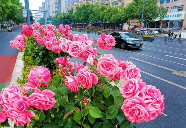 这是郑州市树状月季栽植最集中的道路,道路两侧机动车与非机动车隔离花坛内,绿城广场附近等路段每隔一二十米就有一簇树状月季,每簇近十株,以红、粉色系大花月季为主,最大的一朵月季有25厘米左右。