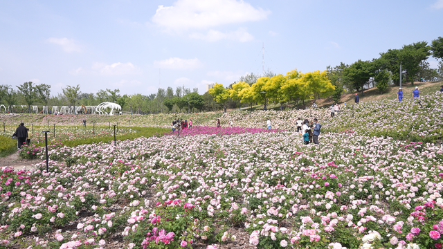 丹红铺彩,橙黄摇曳,浅粉娇嫩……1200余个品种30余万株月季争奇斗艳。地栽月季、盆栽月季、树状月季、造型月季千姿百态,浪漫优雅的气息弥漫在城市之中。
