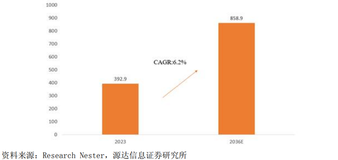 根据Research Nester的数据,2023年离心泵市场规模为392.9亿美元,预计到2036年底将突破858.9亿美元,年复合增速为6.2%。2024年,离心泵行业规模预计为414.8亿美元。