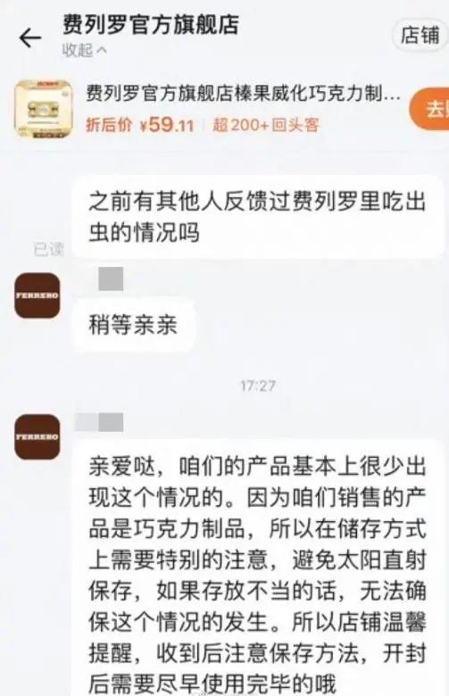 而对于是否接到消费者投诉在巧克力中发现虫子的情况,费列罗电商旗舰店客服表示,产品基本上很少出现这个情况,因为销售的产品是巧克力制品,所以在储存方式上需要特别的注意,避免太阳直射保存,但如果存放不当的话,无法避免这个情况的发生。