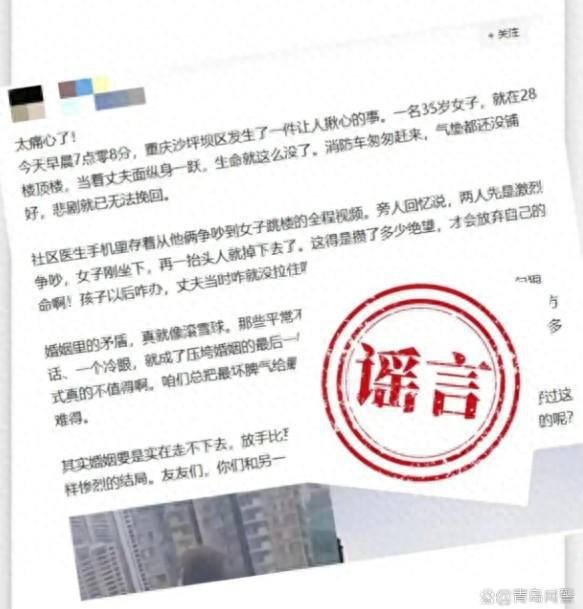 近日,某网民在互联网平台发布信息称“太痛心了!今天早晨7点零8分,重庆沙坪坝区发生了一件让人揪心的事。一名35岁女子,就在28楼顶楼,当着丈夫面纵身一跃,生命就这么没了。消防车匆匆赶来,气垫都还没铺好,悲剧就已无法挽回”,引发关注。