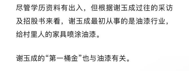 公开资料显示,1963年谢玉成出生于安徽省芜湖南陵县。网上传言谢玉成高中便辍学,出来赚钱养家。最初从事的是油漆行业,给村里人的家具喷涂油漆。(信息来源:公众号“公司研究室”IPO组)