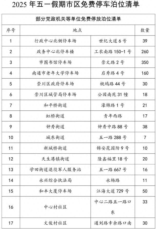 据“南通发布”消息,“五一”假期南通市区提供11722个公共停车泊位,免费供市民停放。具体如下: