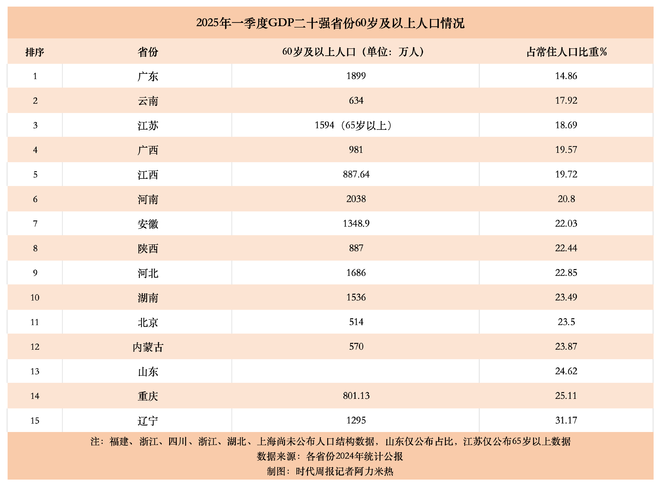 通过数据交叉对比可见,0—15岁少儿人口占比与出生率呈现显著的正相关性,两者排名前五的省份高度重合。经济强省劳动力充足分省份来看,哪些地方的人口红利比较突出呢?杨继瑞分析称,近年来珠三角地区的产业转型升级加快,高端制造业、现代服务业等新兴产业快速发展,为不同层次的人才提供了丰富的就业机会。同时,珠三角地区放宽了落户限制,吸引了人口迁入。由于江苏(15-59岁)、北京人口(15-64岁)结构统计口径不同,如果将它们纳入统一比较,那么劳动人口占比排名前五的省份依次为:江苏、广东、北京、云南和内蒙古。不过,这些省份也面临着新的挑战。以江苏为例,2024年江苏常住人口为8526万人,与上年末持平,首次出现零增长。而江苏人口压力,主要源于自然增长乏力。换句话说,江苏自然减少的人口,完全抹平了人口增量。在此背景下,江苏也意识到持续引人、留人的重要性。与此同时,今年2月份,江苏还推出了15条旨在促进生育的政策措施,其中包括生育津贴无需提交申请材料即可直接发放到账等便利举措。对此,杨继瑞认为,云南和内蒙古传统产业占比较大,新兴产业发展不足,导致产业升级步伐缓慢,再加上相对滞后的教育和科技水平制约了劳动人口素质的整体提升,削弱了区域创新能力。“此外,基础设施的不完善,也会提高企业运营成本,影响投资吸引力。”长期以来,老年人口一直是全国关注的焦点。从区域分布来看,在GDP排名前二十的省份中,半数省份的60岁及以上人口占比超过20%,具体包括辽宁、重庆、山东、内蒙古、北京、湖南、河北、陕西、安徽和河南。31.17%是什么概念?这意味着,每3个人中,就有一个60岁以上的老年人。从长期数据来看,2005年-2019年辽宁出生率基本保持在6‰-7‰之间,相对稳定,从2020年下降至5.16‰,到2024年为4.32‰,处于全国落后水平。此外,《辽宁省人口与计划生育条例》还规定生育女职工产假增加至158天,男方护理假增加至20天。子女不满3周岁的夫妻,每年分别享受累计10天的育儿假。长期以来,老年人口龄化问题也是全国的问题。从区域来看,老龄化程度较深的省份中,中西部地区也榜上有名。细分来看,这些省份既有相同之处,又有不同的地方。与此同时,计划生育政策在中西部地区得到较好落实,生育率下降,年轻人口增长缓慢,而老年人口自然增长以及寿命延长,使得老年人口占比逐渐提高。而对重庆来说,老年人比例相对较高,主要是农村人口流出导致。在此背景下,如何解决积极应对人口老龄化,已成为全国长期面临的重要课题。2025年政府工作报告明确提出“要完善发展养老事业和养老产业政策机制,大力发展银发经济”。这为2025年乃至今后一段时期的养老工作指明了方向。