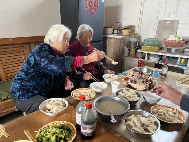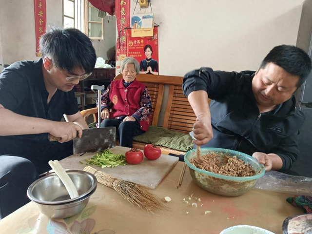在老人家中,工作队员们分工明确,有的负责和面、擀饺子皮,有的忙着切菜、炒菜。大家一边忙碌着,一边和老人唠家常,屋子里充满了欢声笑语。不一会儿,一盘盘热气腾腾的菜肴就端上了餐桌。羊肉馅饺子鲜嫩多汁,蒜薹肉丝色泽鲜艳、口感爽脆,西红柿鸡蛋酸甜适中、营养丰富,西兰花清脆爽口。看着这些精心准备的菜肴,刘桂华老人脸上洋溢着幸福的笑容,连声感谢工作队的关心和照顾。