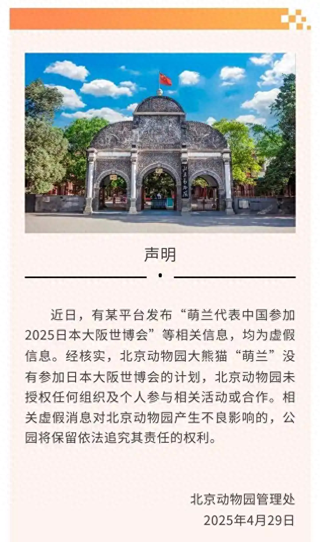 近日,有某平台发布“萌兰代表中国参加2025日本大阪世博会”等相关信息,均为虚假信息。经核实,北京动物园大熊猫“萌兰”没有参加日本大阪世博会的计划,北京动物园未授权任何组织及个人参与相关活动或合作。相关虚假消息对北京动物园产生不良影响的,公园将保留依法追究其责任的权利。