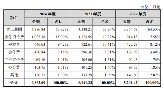 其中,2022—2024年,公司业务招待费分别高达914.15万元、1,333.95万元和1,035.38万元,占销售费用比例分别为17.58%、19.22%和15.09%。
