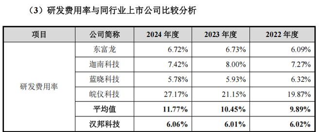 与之形成鲜明对比的是,汉邦科技研发费用率却显著低于同业。