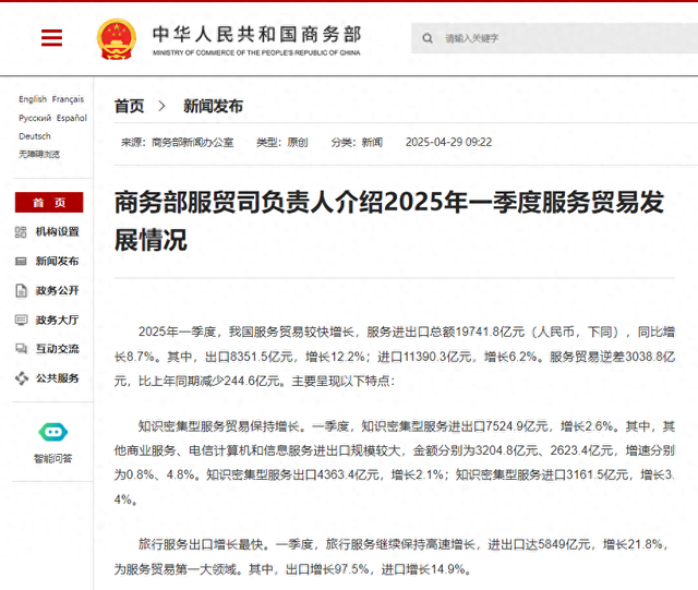 2025年一季度我国服务进出口总额19741.8亿元 同比增长8.7%