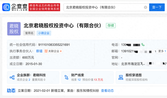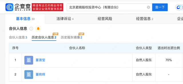 据企查查信息显示,该企业成立于2015年1月,注册资本600万,执行事务合伙人为蔡镭,董袭莹曾于2016年1月接任董晓辉法定代表人、股东角色,企业类型由普通合伙企业变更为有限合伙企业。2018年11月,董袭莹卸任相关职务。