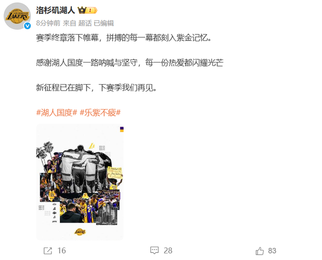 湖人则发文称:“赛季终章落下帷幕,拼搏的每一幕都刻入紫金记忆。感谢湖人国度一路呐喊与坚守,每一份热爱都闪耀光芒。新征程已在脚下,下赛季我们再见。”
