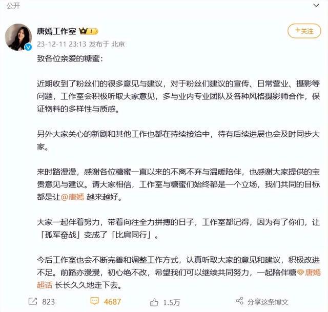 另外大家关心的新剧和其他工作也都在持续接洽中,待有后续进展也会及时同步大家。来时路漫漫,感谢各位糖蜜一直以来的不离不弃与温暖陪伴,也感谢大家提供的宝贵意见与建议。请大家相信,工作室与糖蜜们始终都是一个立场,我们共同的目标都是让@唐嫣 越来越好。大家一起伴着努力,带着向往全力拼搏的日子,工作室都记得,因为有了你们,让「孤军奋战」变成了「比肩同行」。今后工作室也会不断完善和调整工作方式,认真听取大家的意见和建议,积极改进不足。前路亦漫漫,初心绝不改,希望我们可以继续共同努力,一起陪伴唐嫣长长久久地走下去。”