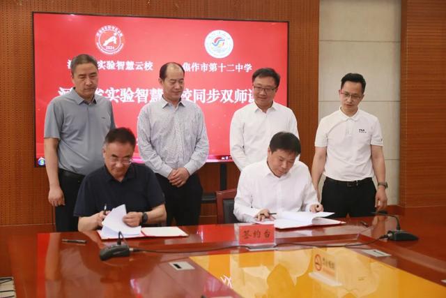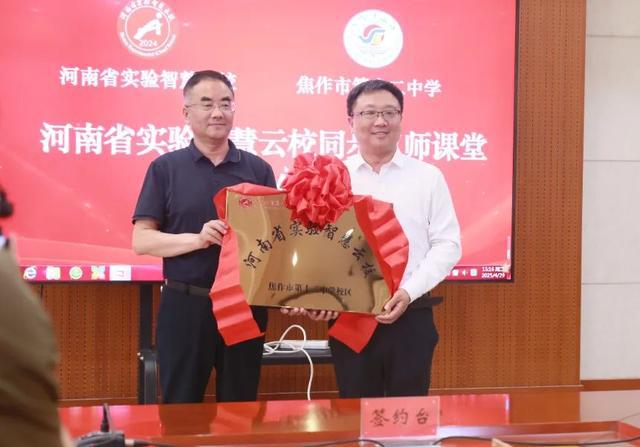 河南省实验中学副校长李晓峰和焦作市第十二中学校长李运方签约,并为焦作市第十二中学授牌匾。两校采用“同作息、同上课、同教师、同教研、同教材、同教辅、同作业、同考试”“主讲老师、把关老师、学习老师、落地老师、助教老师、技术老师”六位一体的方式开展合作,“八个同步、六位一体”的合作方式让我们看到了双方携手共进、推动教育创新发展的坚定决心。焦作学子不必到处奔波即可在本市享受到更加优质的教育资源。