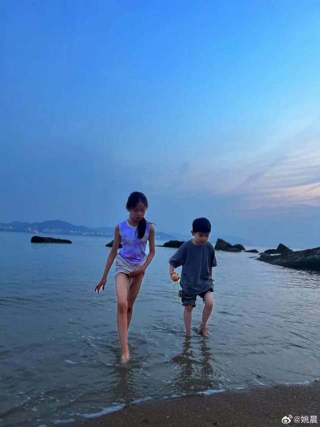 “五一”小长假,46岁姚晨晒带娃赶海照,一家三口罕见同框