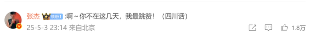 张杰在评论区回应:“啊~你不在这几天,我最跳赞!(四川话,网友称此为‘很活跃、放得开’的意思)”